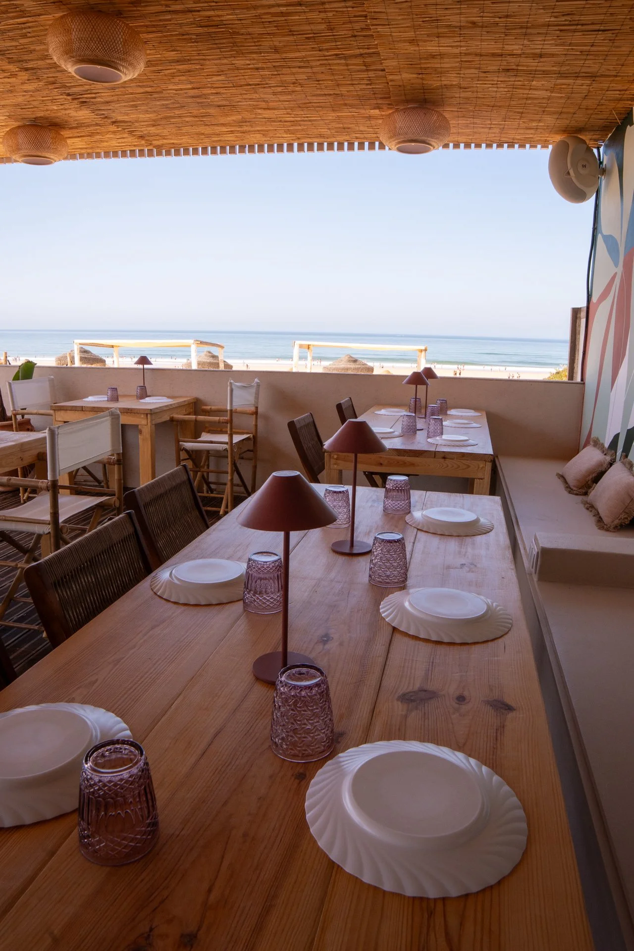 Beachside restaurant with wooden tables set with plates, purple glasses, small pink table lamps, and a mural of abstract leaves on the wall. Open view of the beach and ocean in the background.