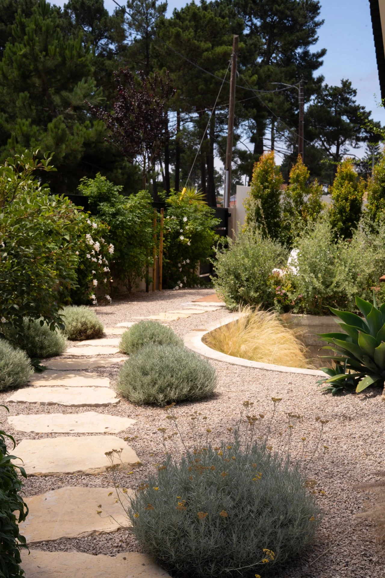 A peaceful garden path lined with various green and flowering plants, including bushes, succulents, and ornamental grasses, with a backdrop of trees and power lines.