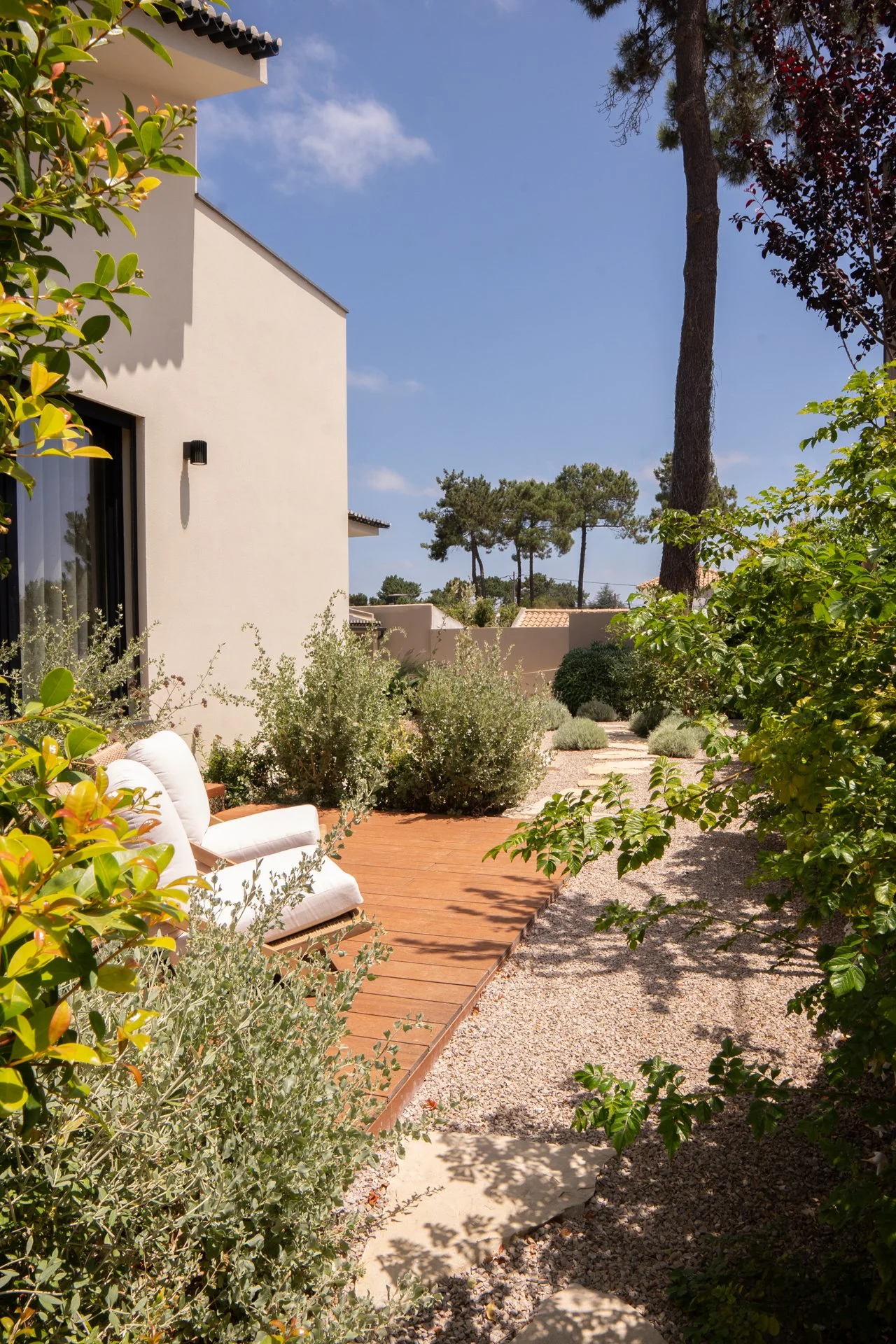A modern house with a white exterior, surrounded by a landscaped yard with bushes, small trees, a wooden deck with two white-cushioned chairs, and a gravel pathway under a blue sky with clouds.