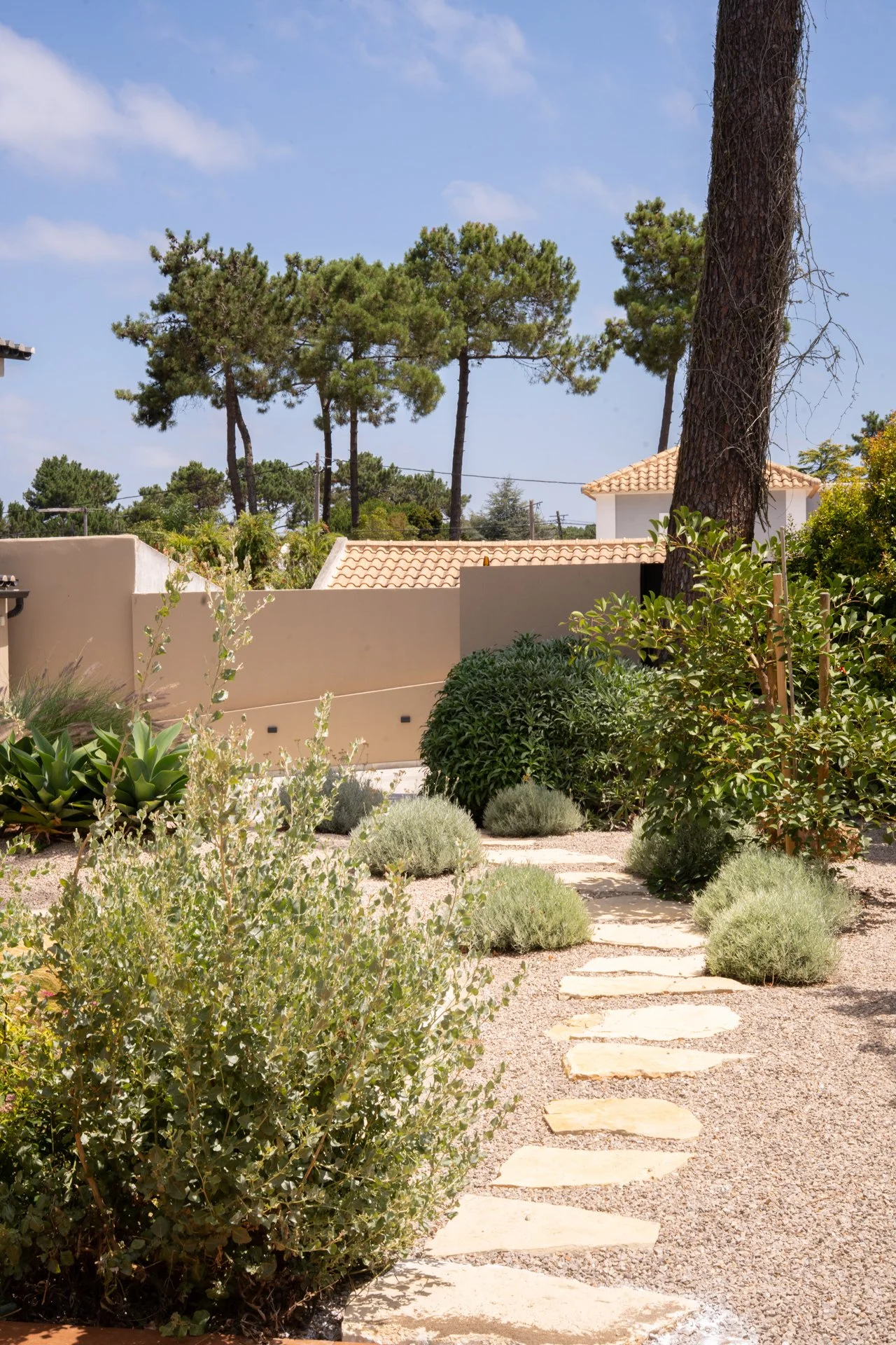 A serene backyard garden with a stone pathway surrounded by various green bushes and succulents, enclosed by beige walls, with tall pine trees and a blue sky in the background.