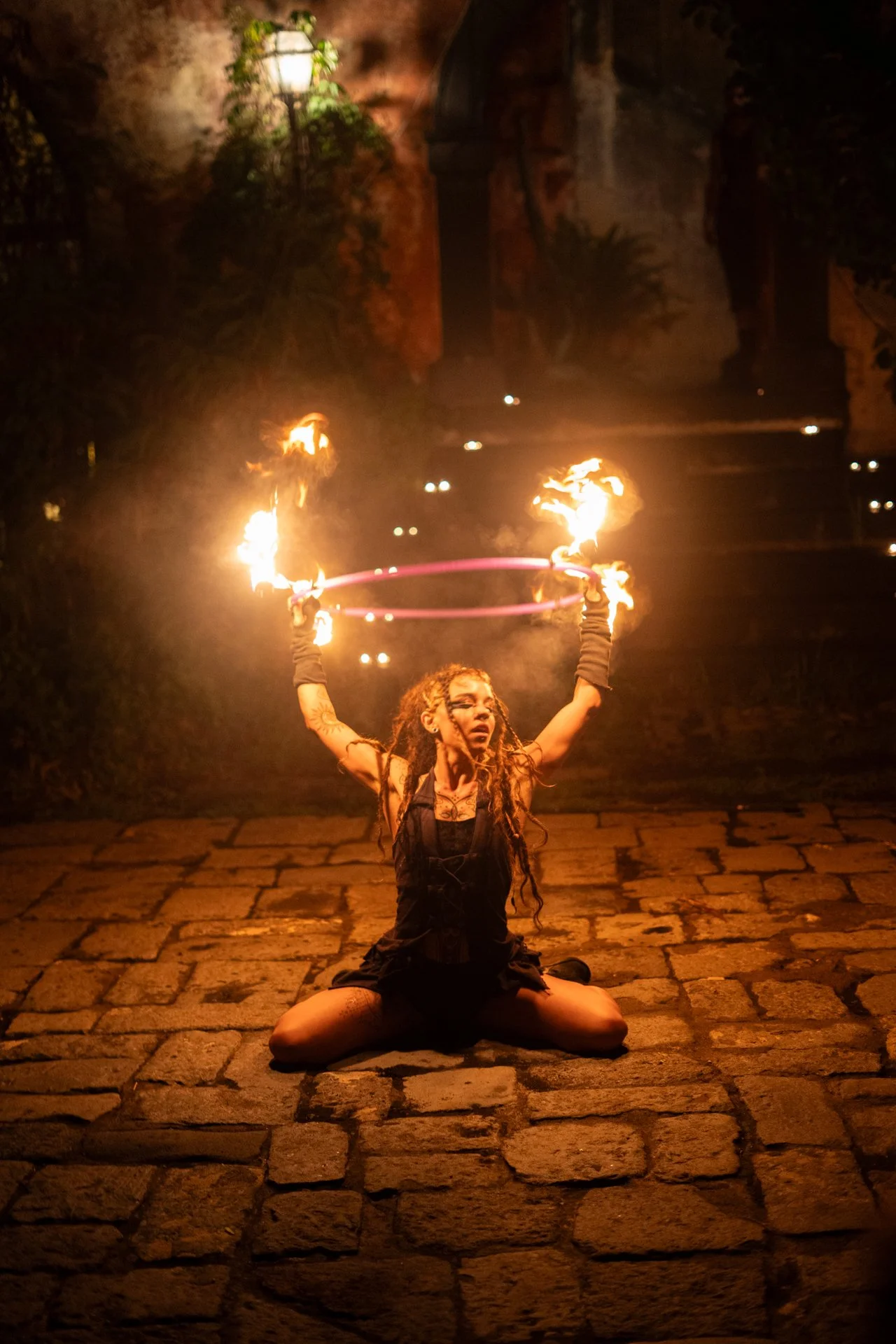 A woman performing fire spinning art at night, sitting on a cobblestone ground, holding fire poi with flames in the air around her.