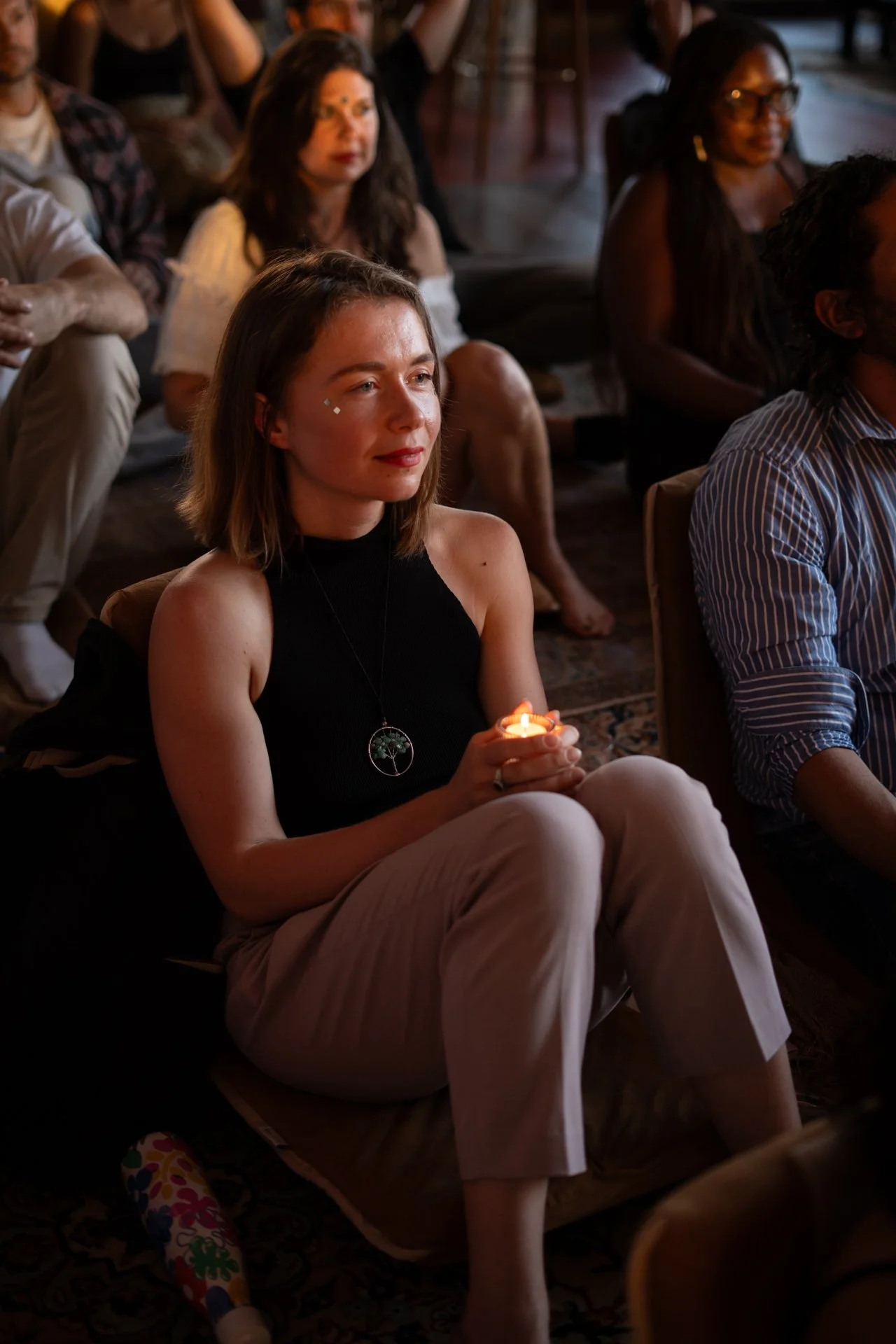 A woman sitting cross-legged on the floor, holding a lit candle, with a gentle smile and closed eyes, in a dimly lit room with other people seated around her.