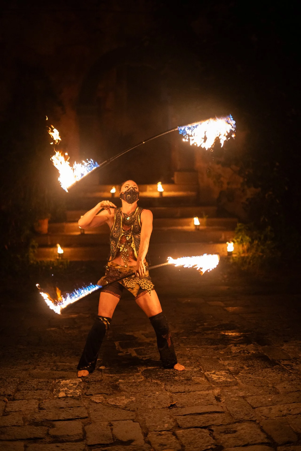 A woman performing fire dancing at night, spinning flaming poi or staffs, with steps and candles in the background.