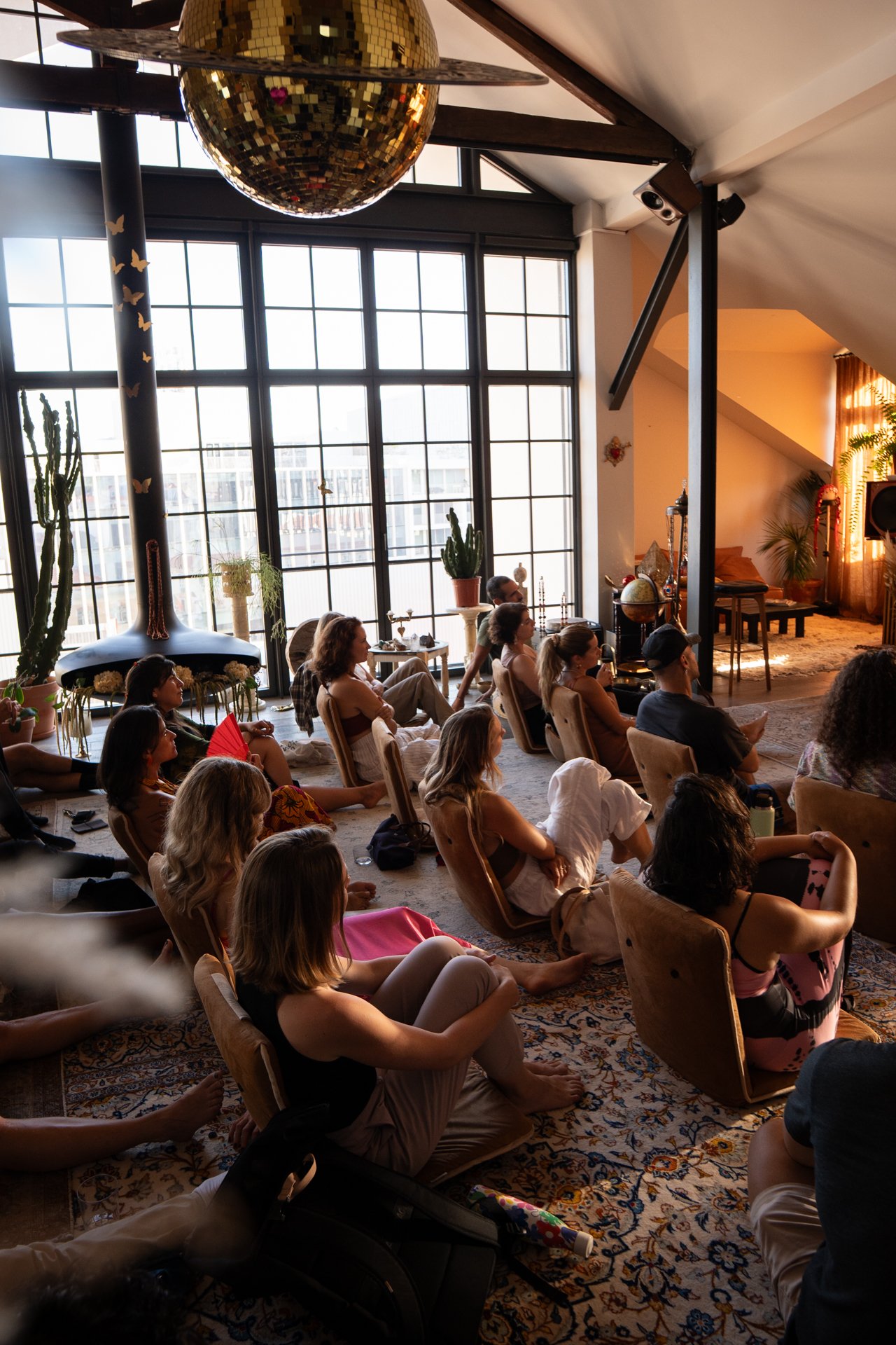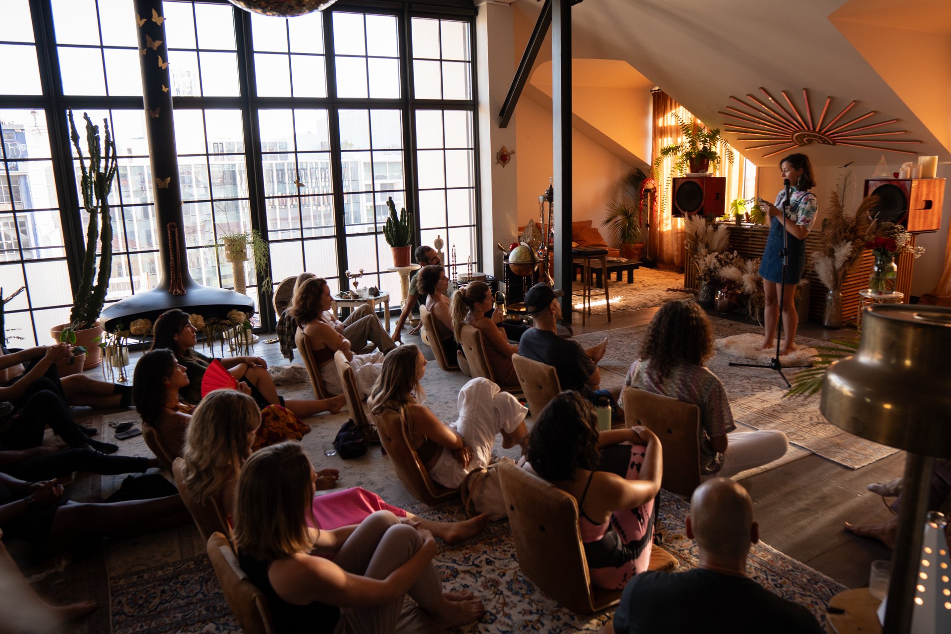 People sitting on the floor and chairs, watching a presentation or performance in a large, bright room with tall windows, potted plants, and decorative objects.