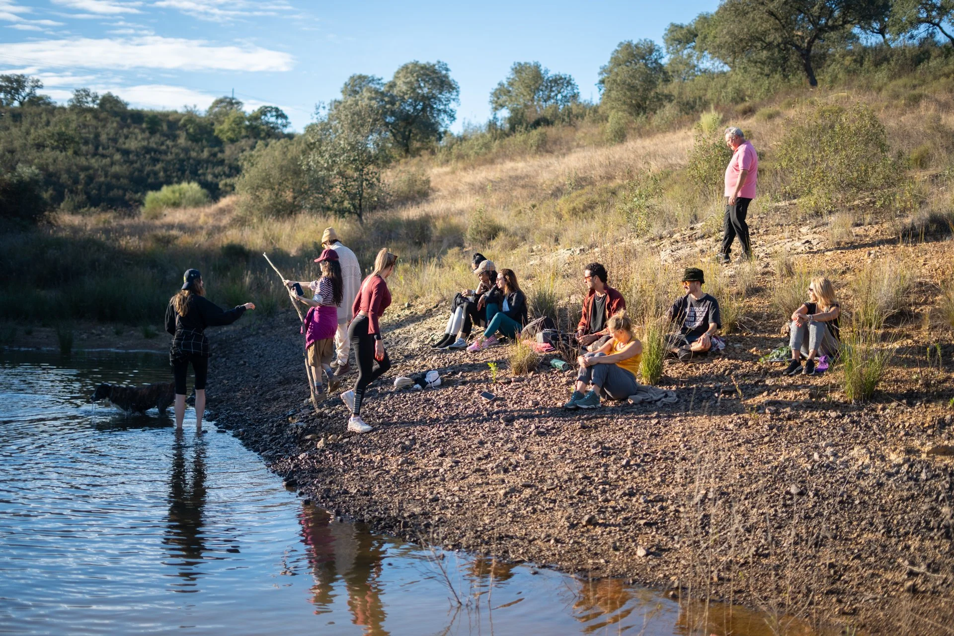 Group of people by a lakeshore, some sitting and some standing, with trees and hills in the background, on a sunny day.