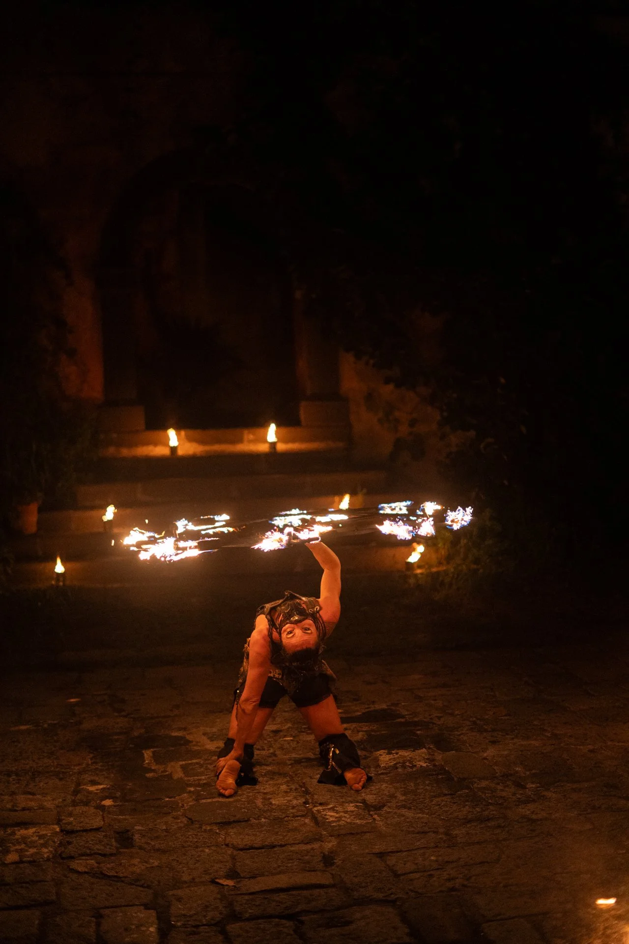 Two performers are engaging in a fire spinning act outdoors at night, with one person holding two hoops with flaming torches, and the other person supporting them. The scene is illuminated by the flames and a nearby lantern, with stone steps, greener