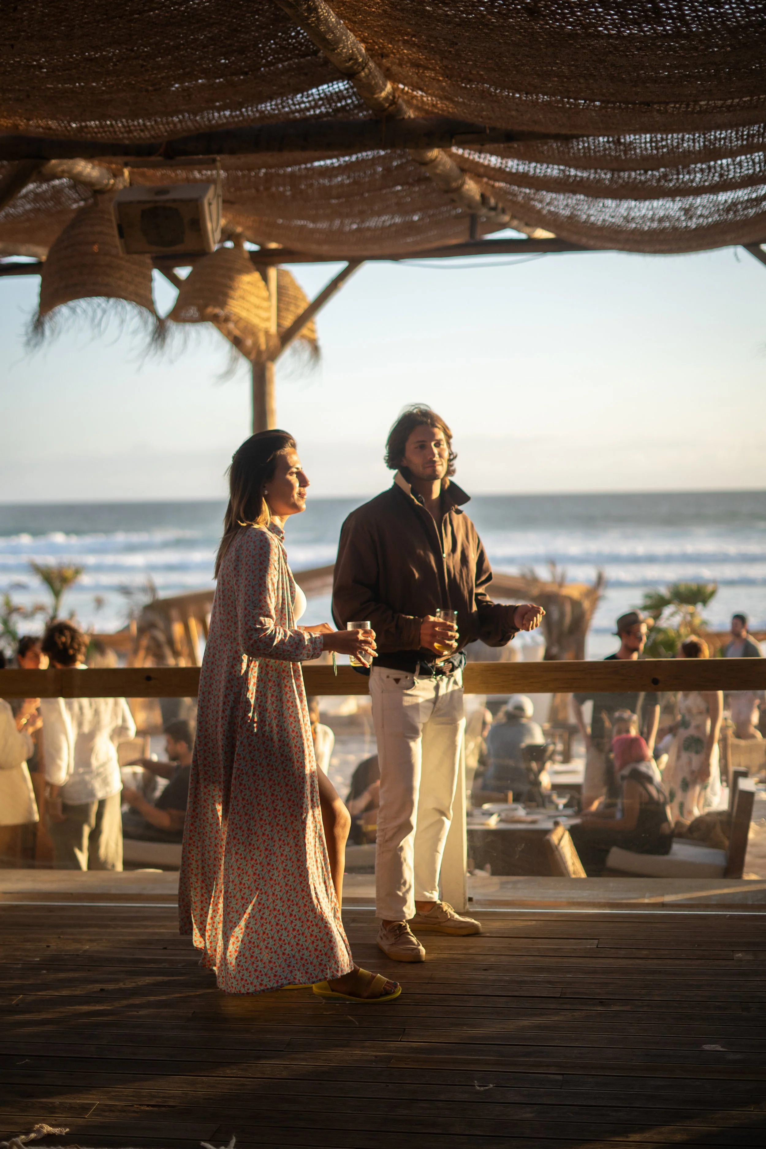 A man and woman standing on a wooden deck at a beachside party during sunset, holding drinks and talking.