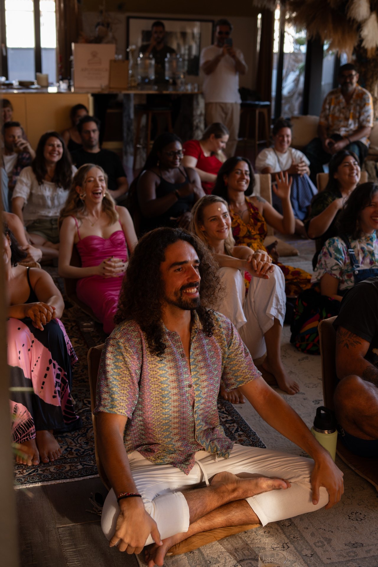 A group of people sitting on the floor and some on chairs, smiling, and engaging with a speaker or performance in a cozy, rustic indoor space. Some are raising hands and appear joyful.