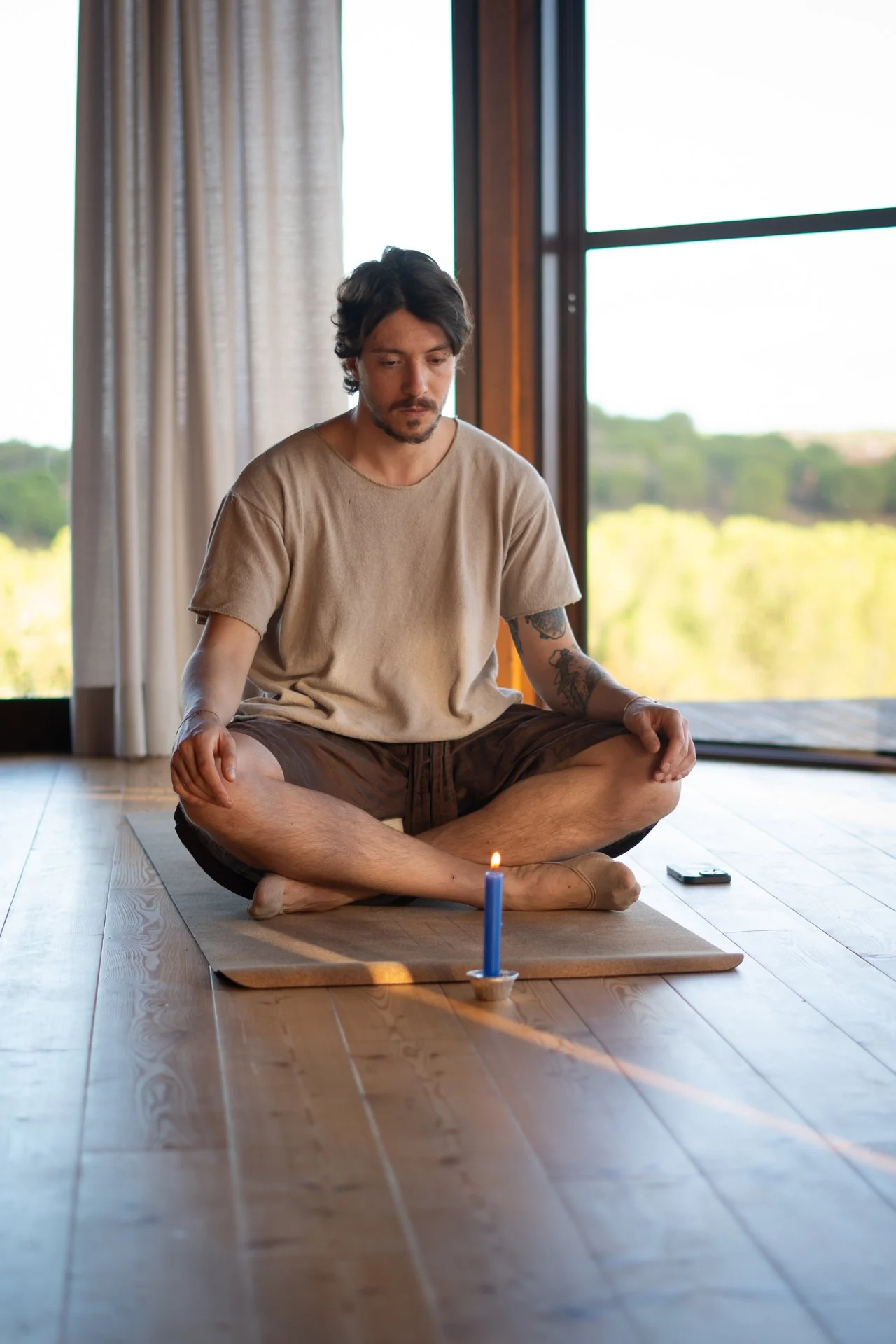 A man sitting cross-legged on a yoga mat, meditating in front of a lit candle, inside a room with large windows and wooden floors.