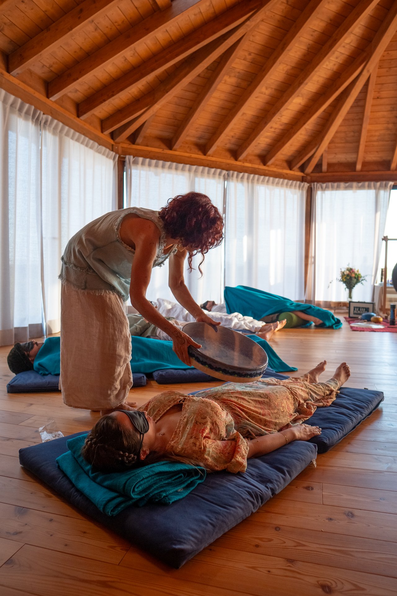 A woman lying on a yoga mat with an eye mask, receiving a crystal bowl sound healing from a practitioner in a spacious room with wooden ceiling beams and large windows with curtains.