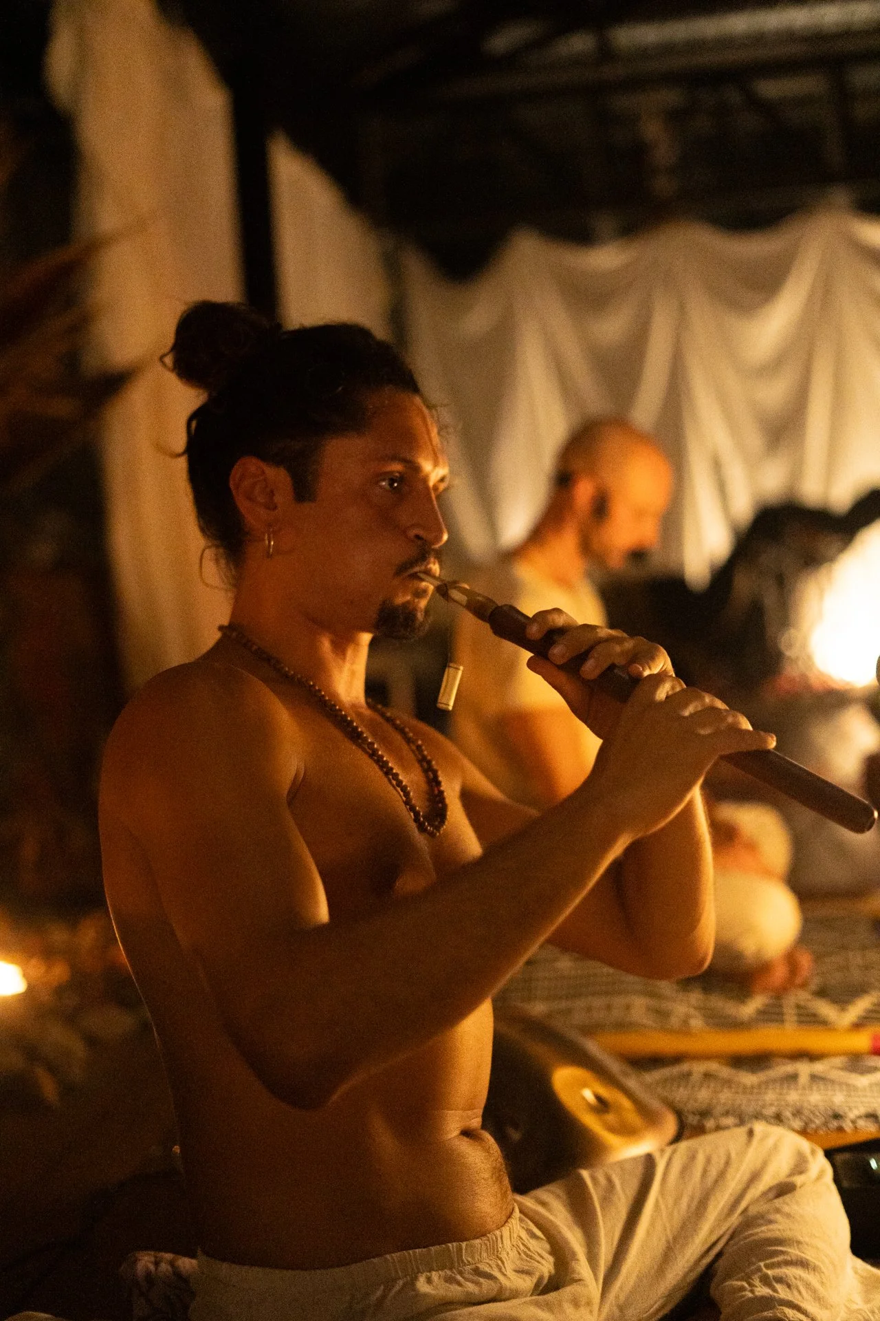 A shirtless man with a topknot hairstyle and beaded necklaces is playing a flute in a dimly lit room with cloth drapes in the background.