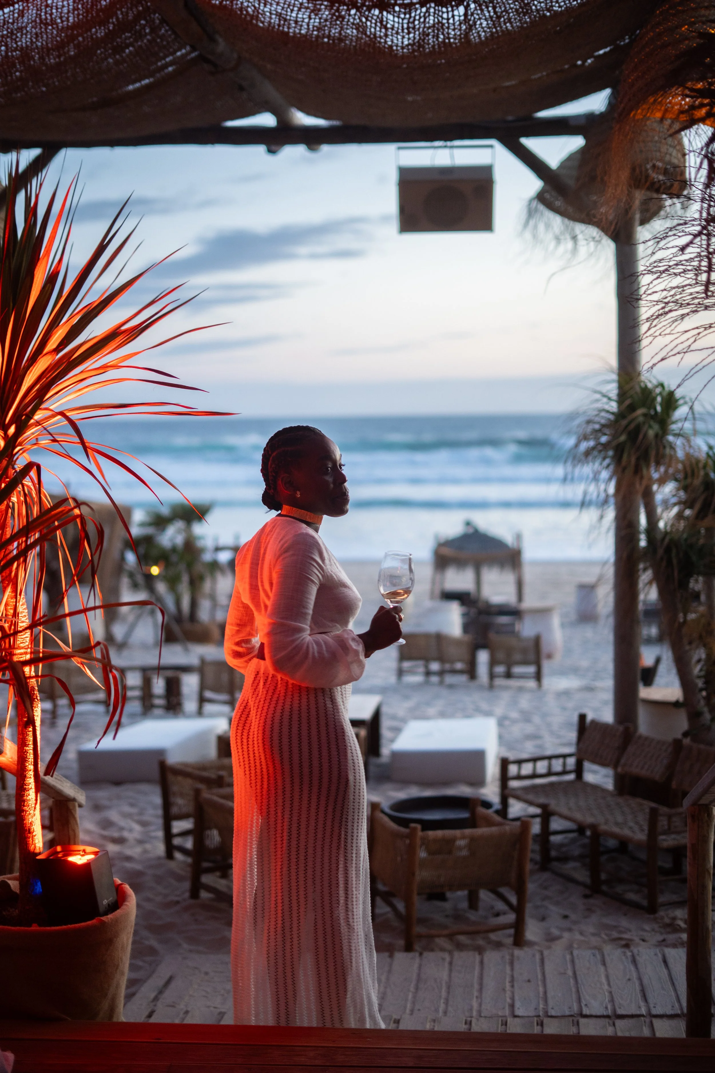A woman standing on a beach at sunset, holding a wine glass, with lounge chairs and the ocean in the background.