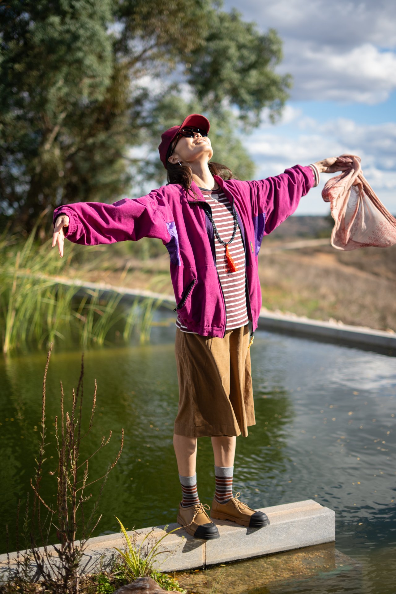 A woman stands on a concrete platform at the edge of a body of water, with her arms outstretched and her face tilted up. She is wearing a red cap, sunglasses, a purple jacket, striped shirt, brown shorts, striped socks, and yellow shoes. She holds a