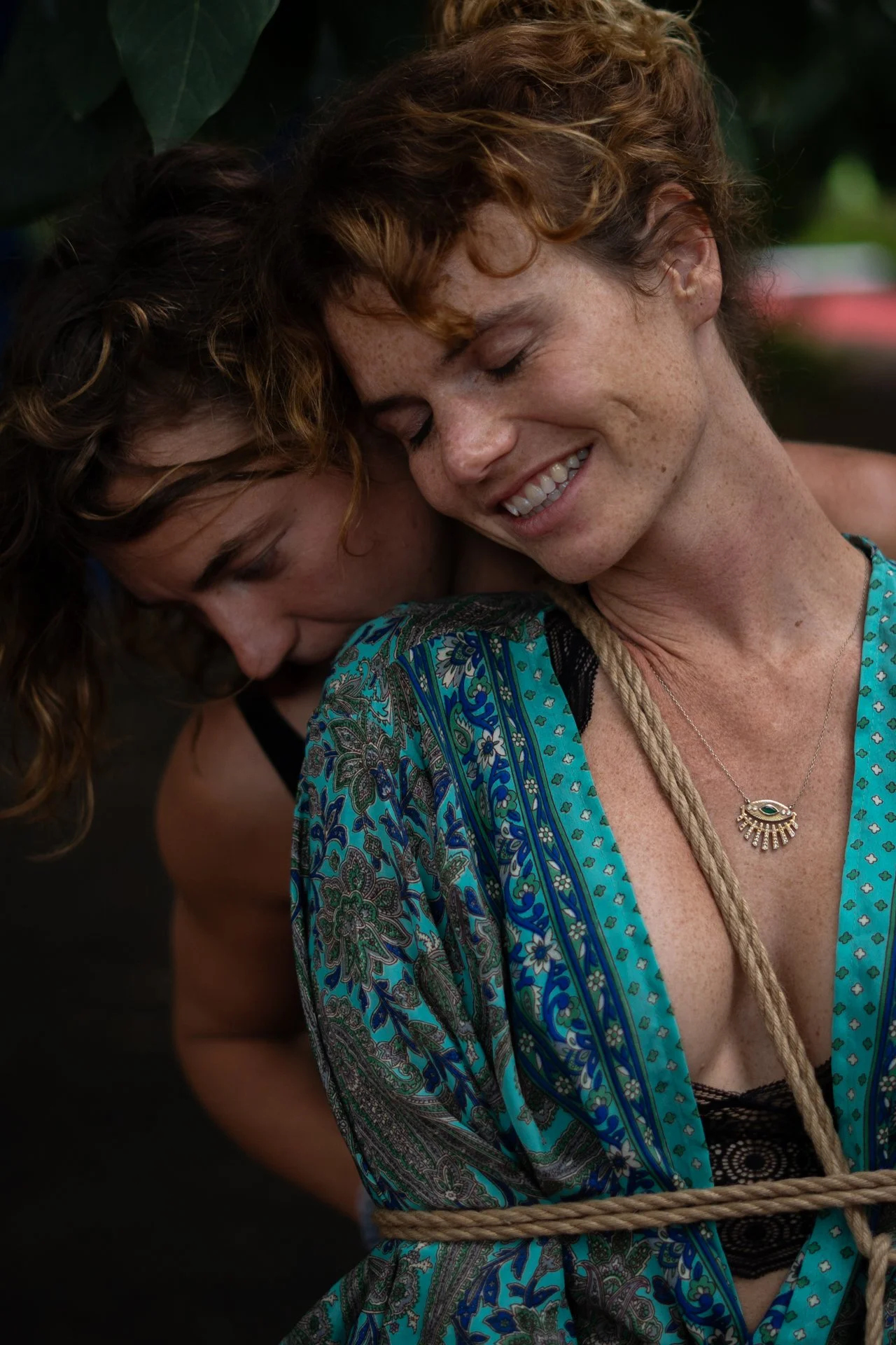Two women, one with curly red hair and one with straight brown hair, share an embrace, with the red-haired woman smiling and the other resting her head on her shoulder. They are outdoors.