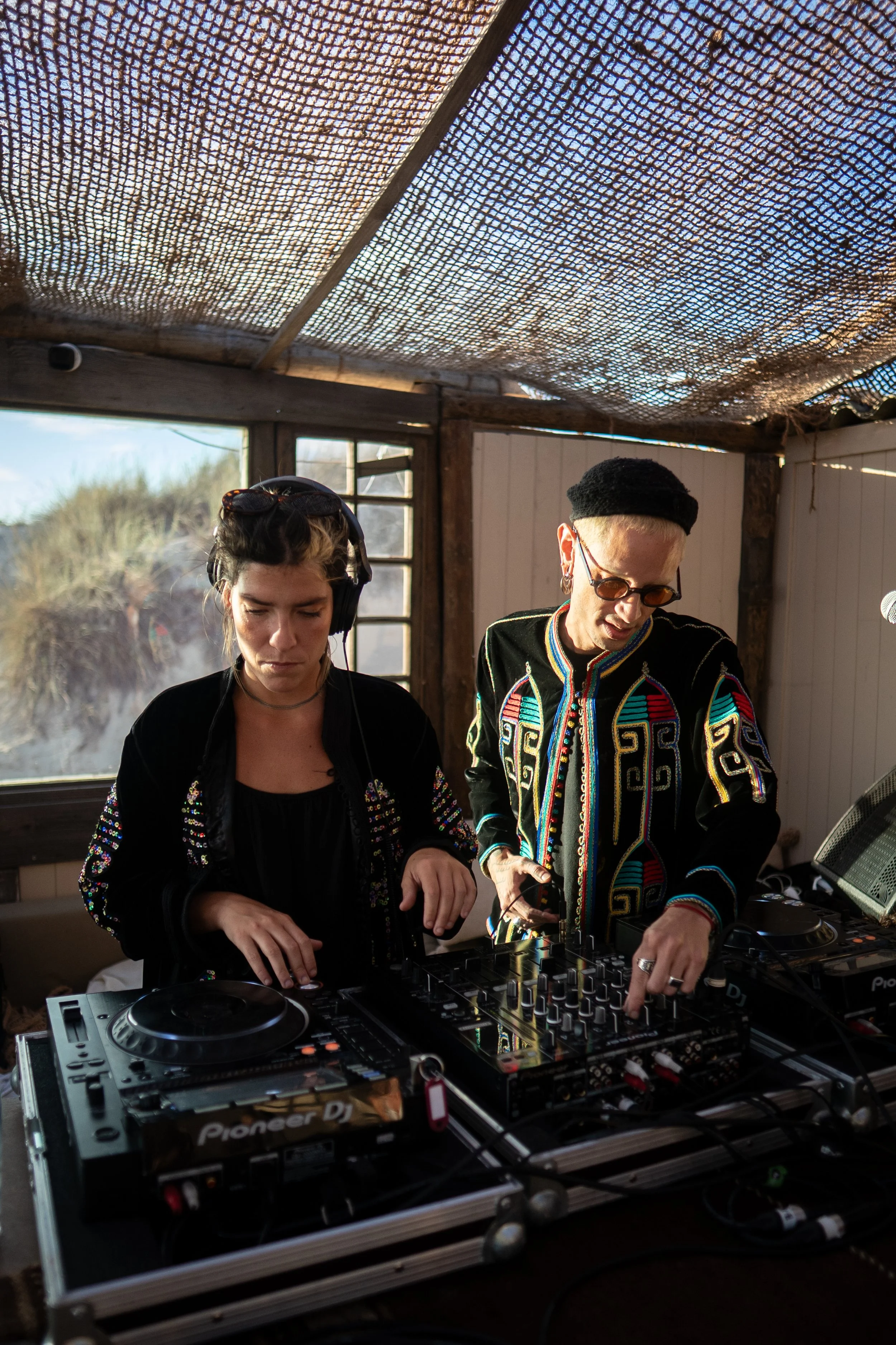 Two DJs, a woman and a man, are performing together at a music event with DJ equipment, inside a wooden structure with a netted roof and windows showing outdoor scenery.