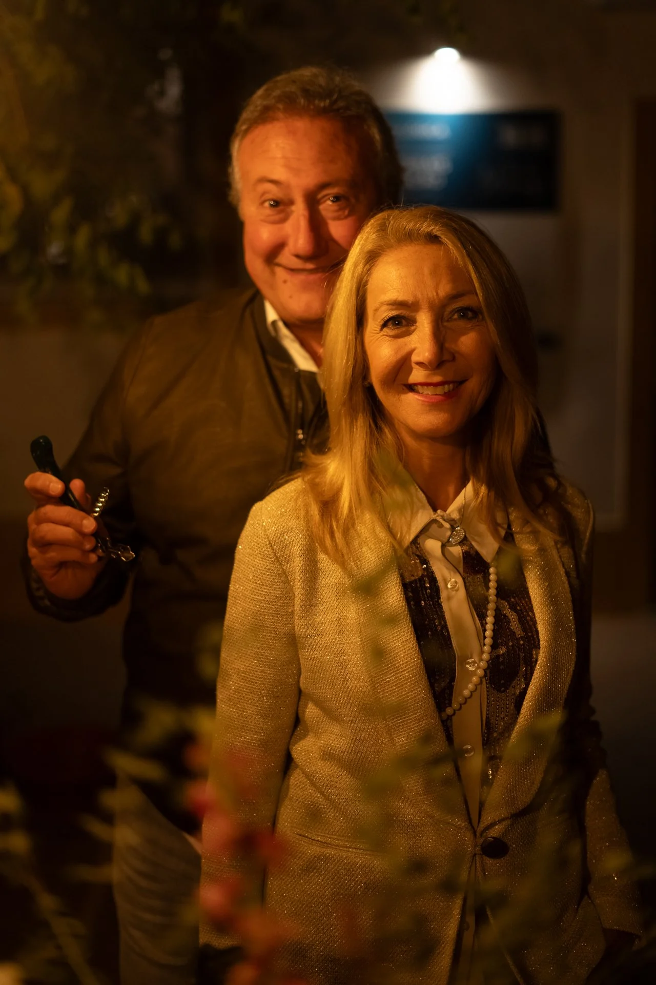 A man and a woman smiling at the camera in an outdoor setting at night, with dim warm lighting and a blurred background.
