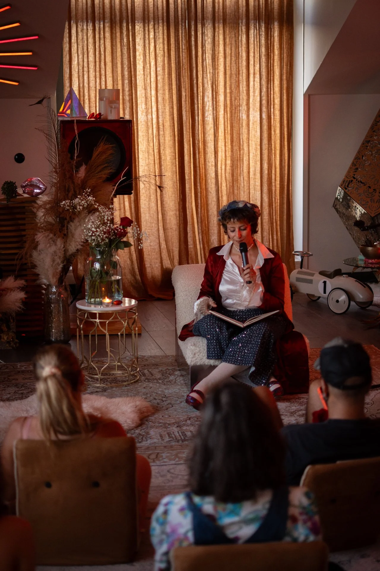 Indoor event with a woman performing on stage in front of an audience in a decorated room with warm lighting, curtains, plants, and eclectic decor.
