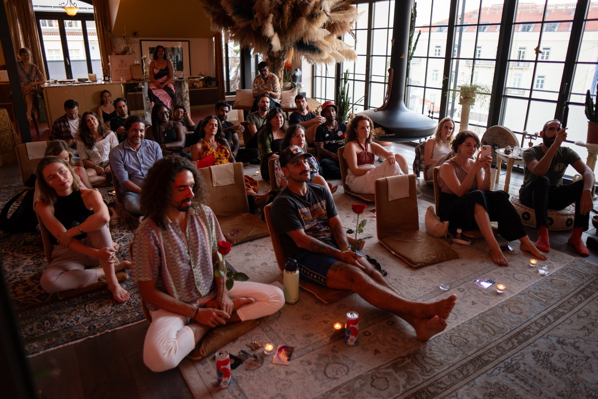 Group of people sitting on the floor and chairs in a cozy indoor space with large windows, facing forward, some holding candles, with roses and candles on the floor, and a large decorative feathered hanging sculpture overhead.
