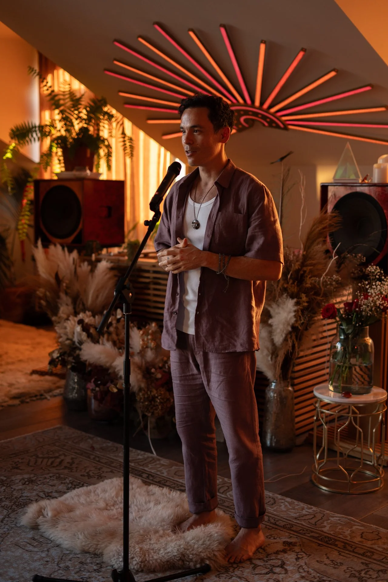 A man speaking into a microphone in a cozy, warmly-lit room with decorative plants, flowers, and modern art, standing on a fluffy rug near a small table with a vase of flowers.