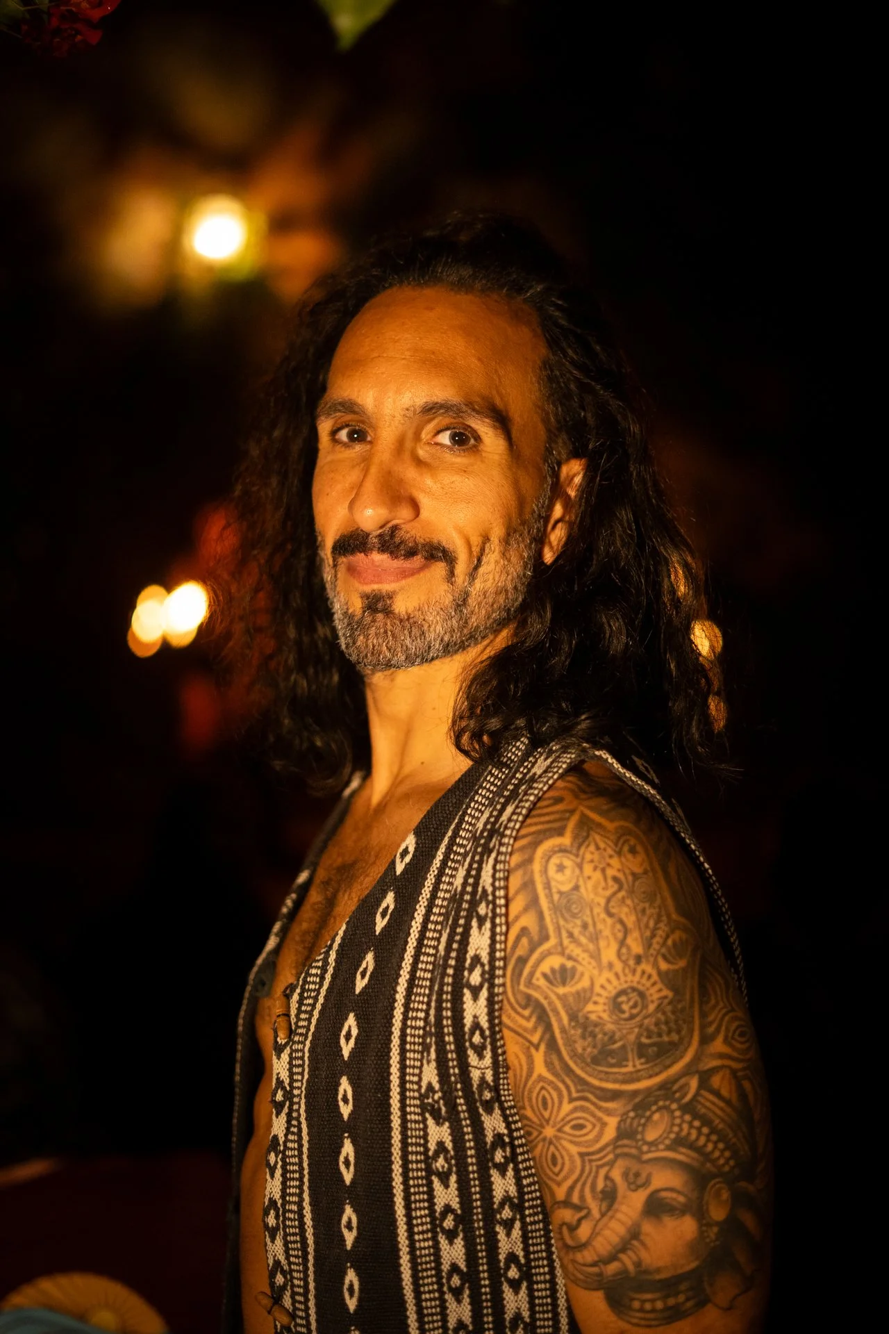 A man with long dark hair, a beard, and tattoos on his arm, smiling at the camera against a dark background with warm light nearby.