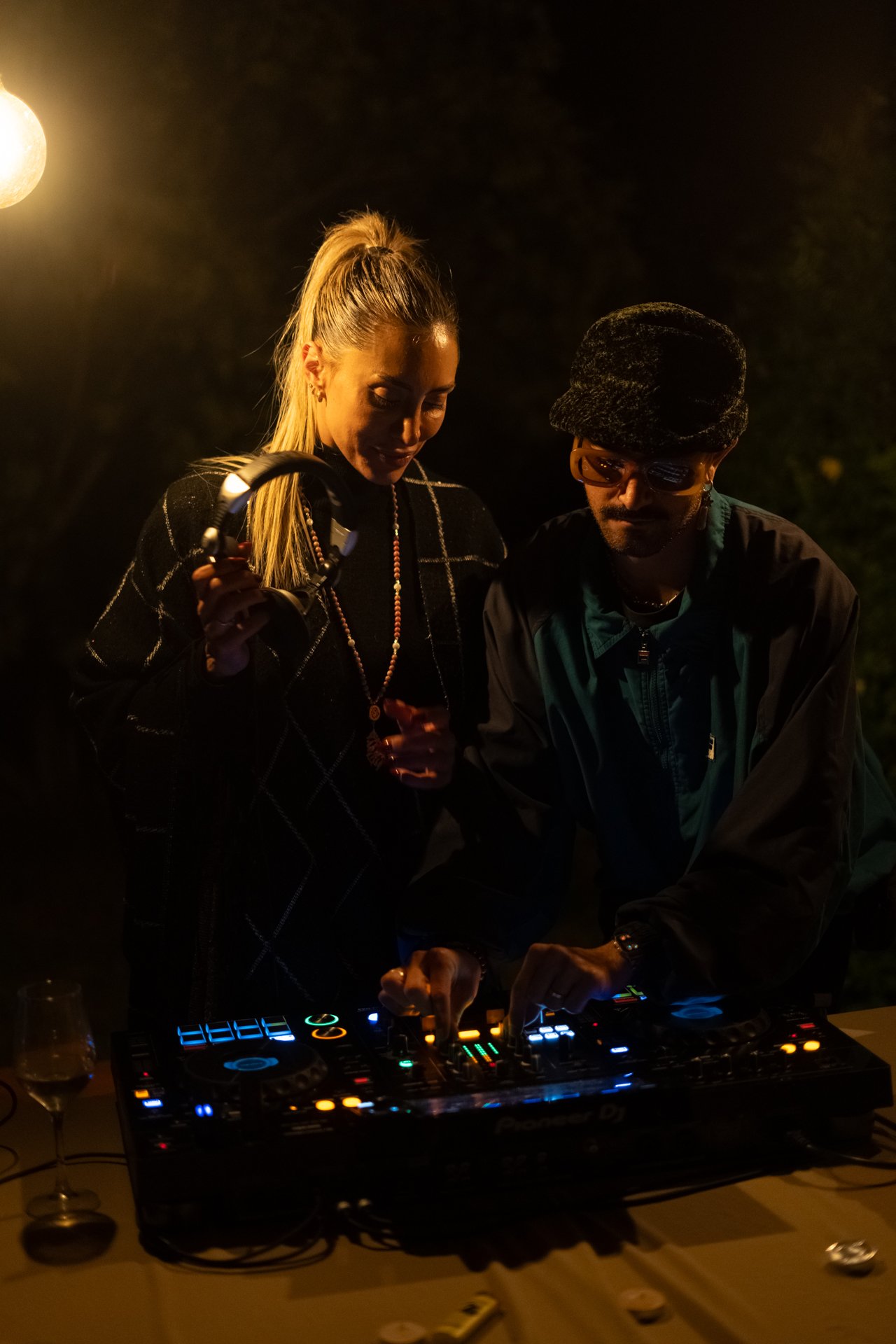 Two people, a woman with blonde hair and a man with glasses and a hat, are DJing at night.