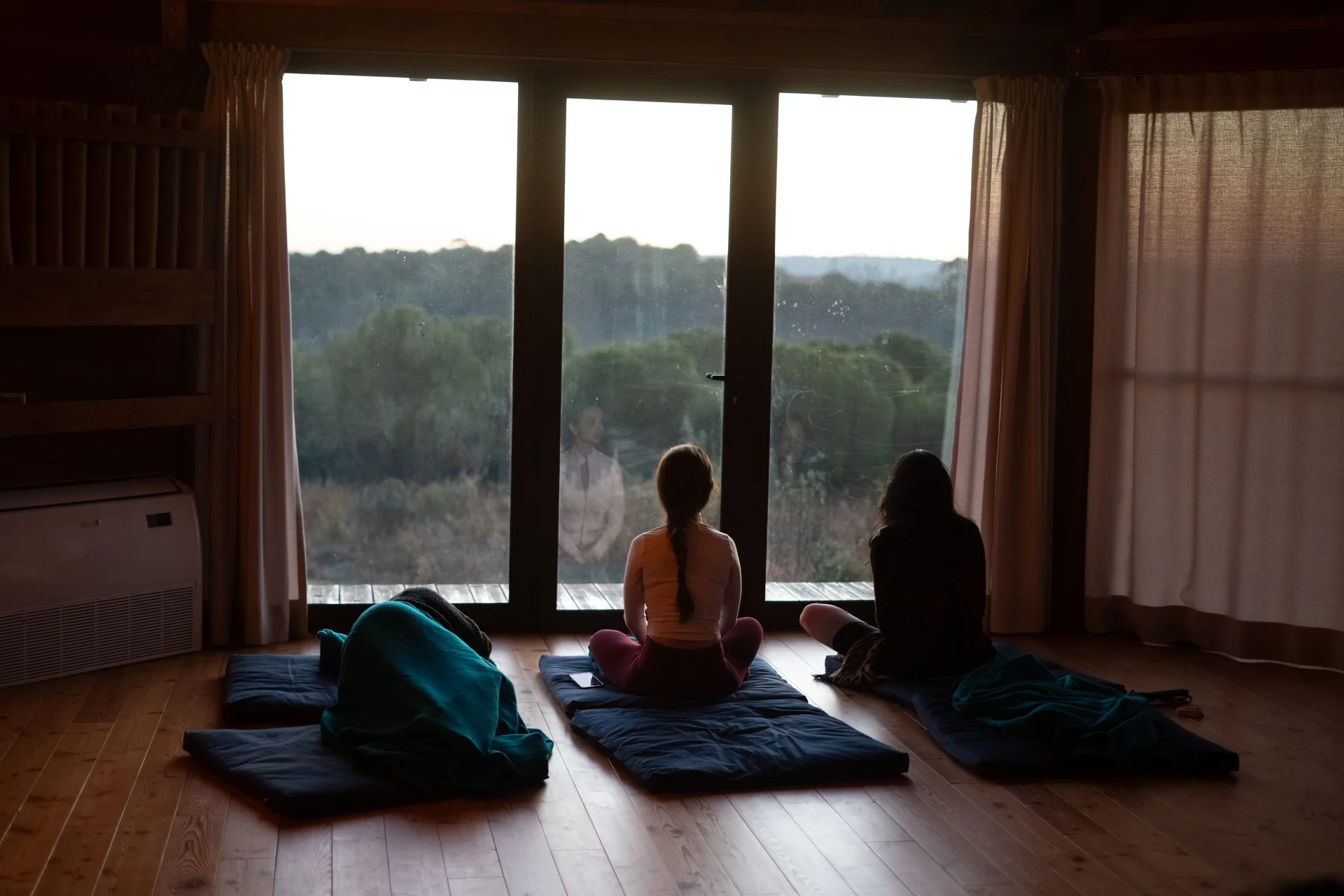 Two women sit on mats in front of a large window, observing a person outside through the glass in a cozy, wooden-paneled room with curtains and an air conditioning unit.